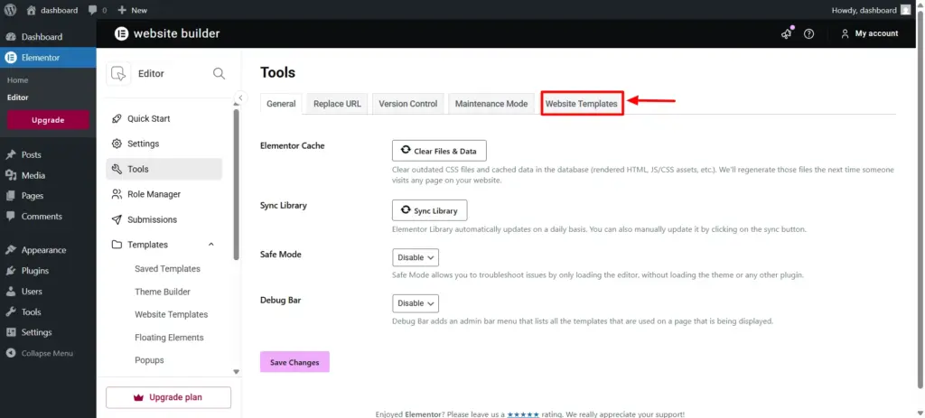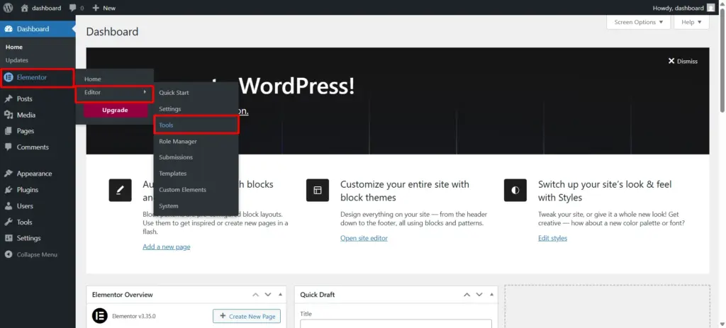 4. Next, go to WP Admin and navigate to Elementor > Editor > Tools.