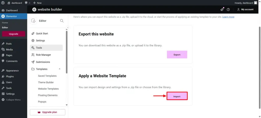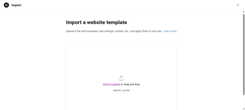 7. Upload the downloaded Elementor JSON template ZIP file.