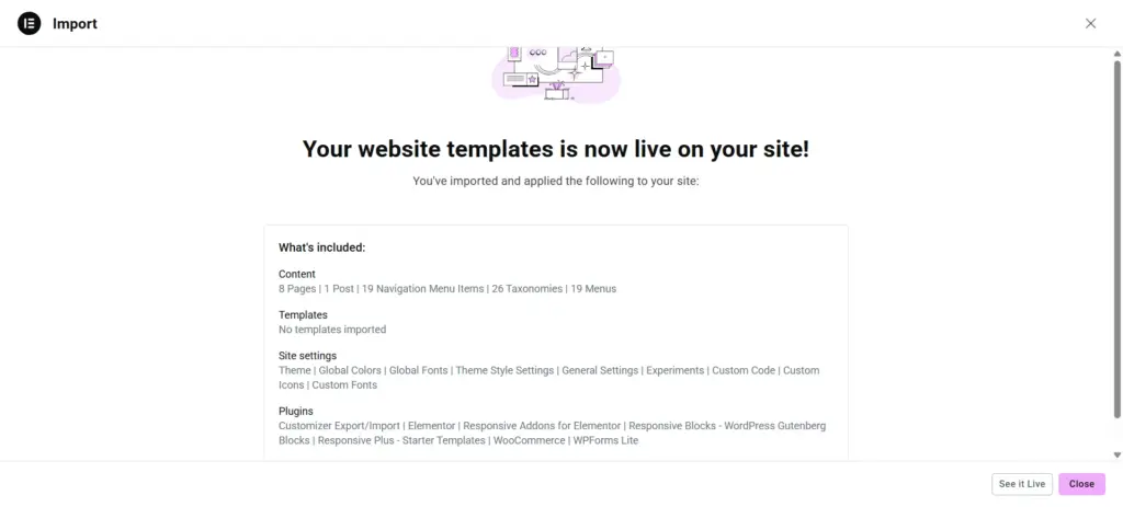 Having previous content on the website can lead to possible conflicts with the Elementor template you are importing and may not give you the results you desire when applying the new template.
