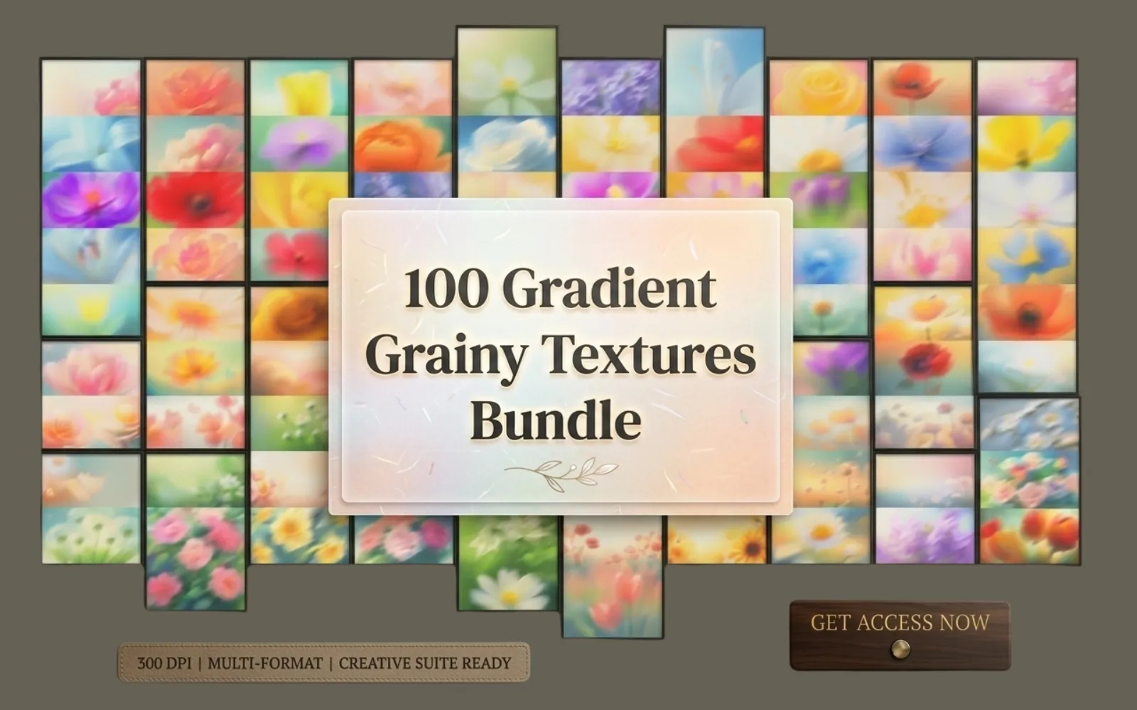 A dreamy collection of 100 floral-inspired gradient grainy textures in PNG and JPG formats.