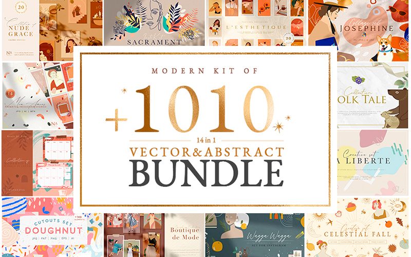 Inside this Modern Vector Collection, there are thousands of different elements, backgrounds, patterns, alphabets, individual illustrations, postcards, posters, Instagram templates, clipart, and much more.