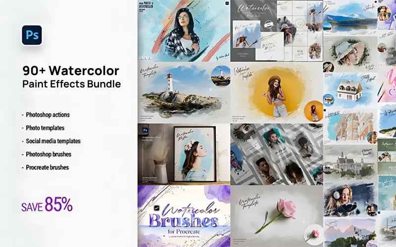 90+ Watercolor Paint Effect Photoshop Bundle.